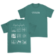 Abby Powledge Official Merchandise. Emerald 100% cotton unisex t-shirt with a retail fit featuring white icons on the front: a heart, a circle, a square and a star. The back displays a 3x3 grid of nine white line-art illustrations. Above the grid, the text "Abby Powledge" is written in a playful, handwritten style with small stars around it.