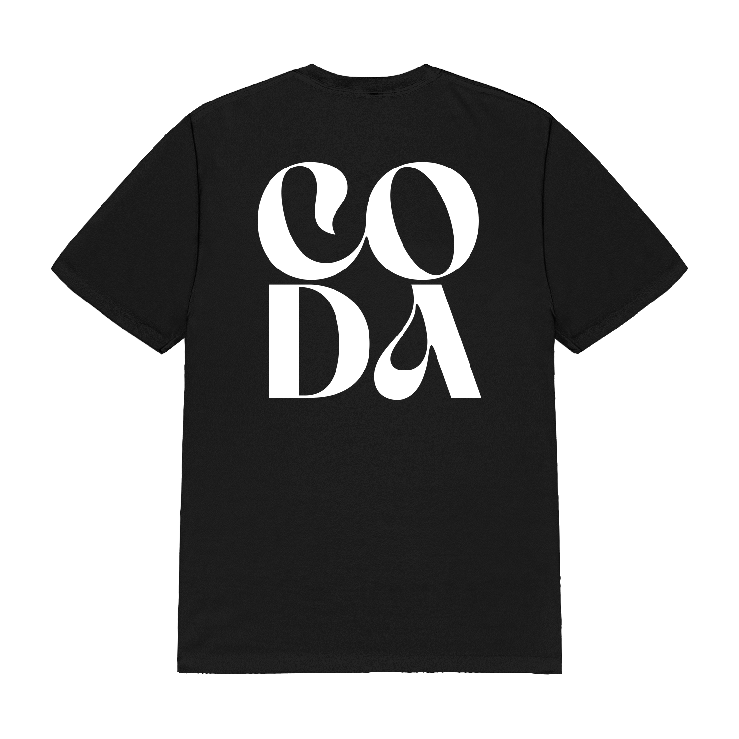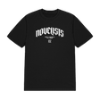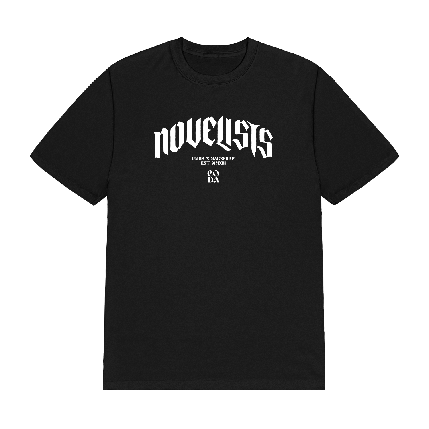 Novelists Official Merchandise. Black 100% cotton unisex t-shirt with a retail fit featuring the word "NOVELISTS" in a large, arched and white gothic-style font, with "PARIS vs MARSEILLE" written in smaller text. The back displays the word "CODA" in an oversized styled white font.